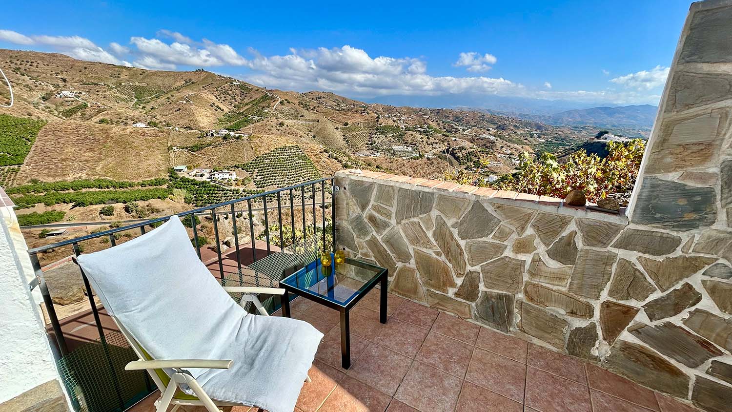 Vakantiehuis Casa Arroyo de la Palma is prachtig gelegen op een met wijnranken en mangobomen beplante heuveltop, u heeft een indrukwekkend uitzicht op het authentieke witte dorp El Borge en grote delen van de streek La Axarquia. Het overdekte panorama-terras bevindt zich in de hoek van het pand en is door middel van een glazen schuifpui met de woonkamer verbonden.